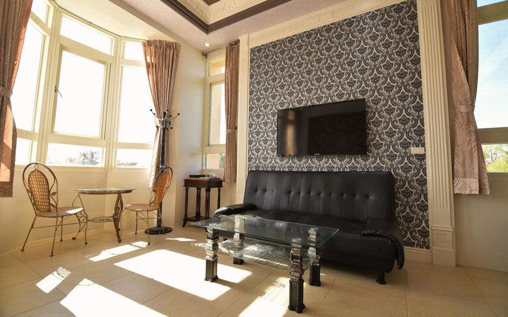 宜蘭民宿「我的最愛心湖夢幻城堡」擁有達26坪之廣的寬闊挑高豪華客廳,2.62米的聳立大門搭配華麗的水晶吊燈,壯觀富麗的程度讓人為之讚嘆。此外,可容納兩人及四人的房型空間,更是以高雅貴氣的歐式風格為設計主軸。高貴的家具、柔軟的寢具和璀璨的燈具,在寬敞明亮的格局和明媚的綠意景緻輝映下,更顯夢幻、優雅、舒適而清新。
